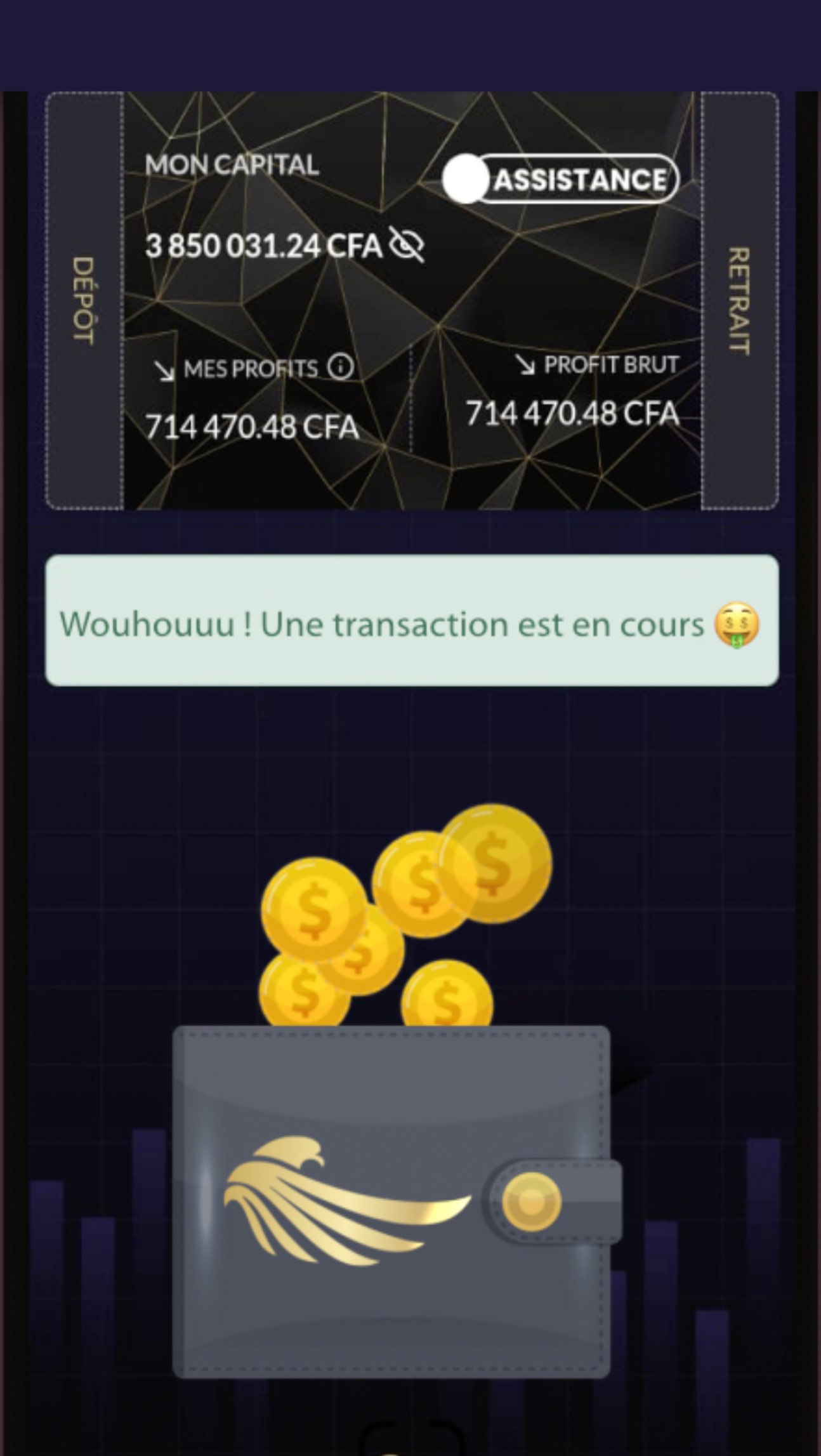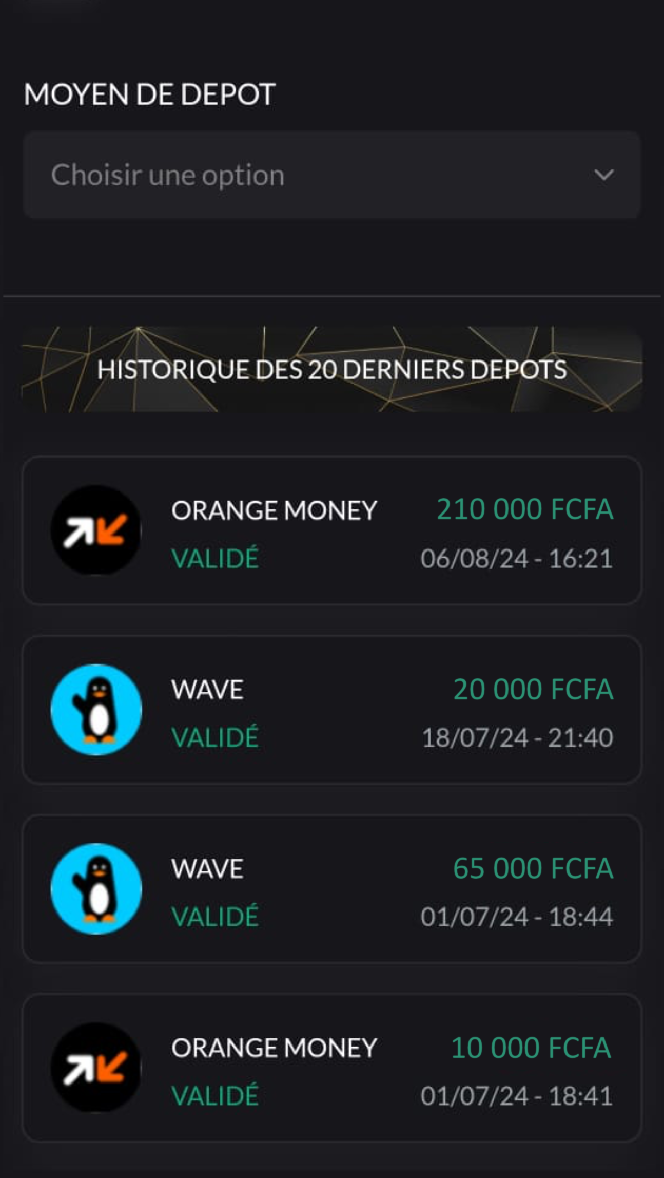 Vos dépôts et retraits sont totalement libres dépendant des limitations imposées par la passerelle (Visa, Orange Money, Wave etc...) que vous avez choisi pour faire l'opération